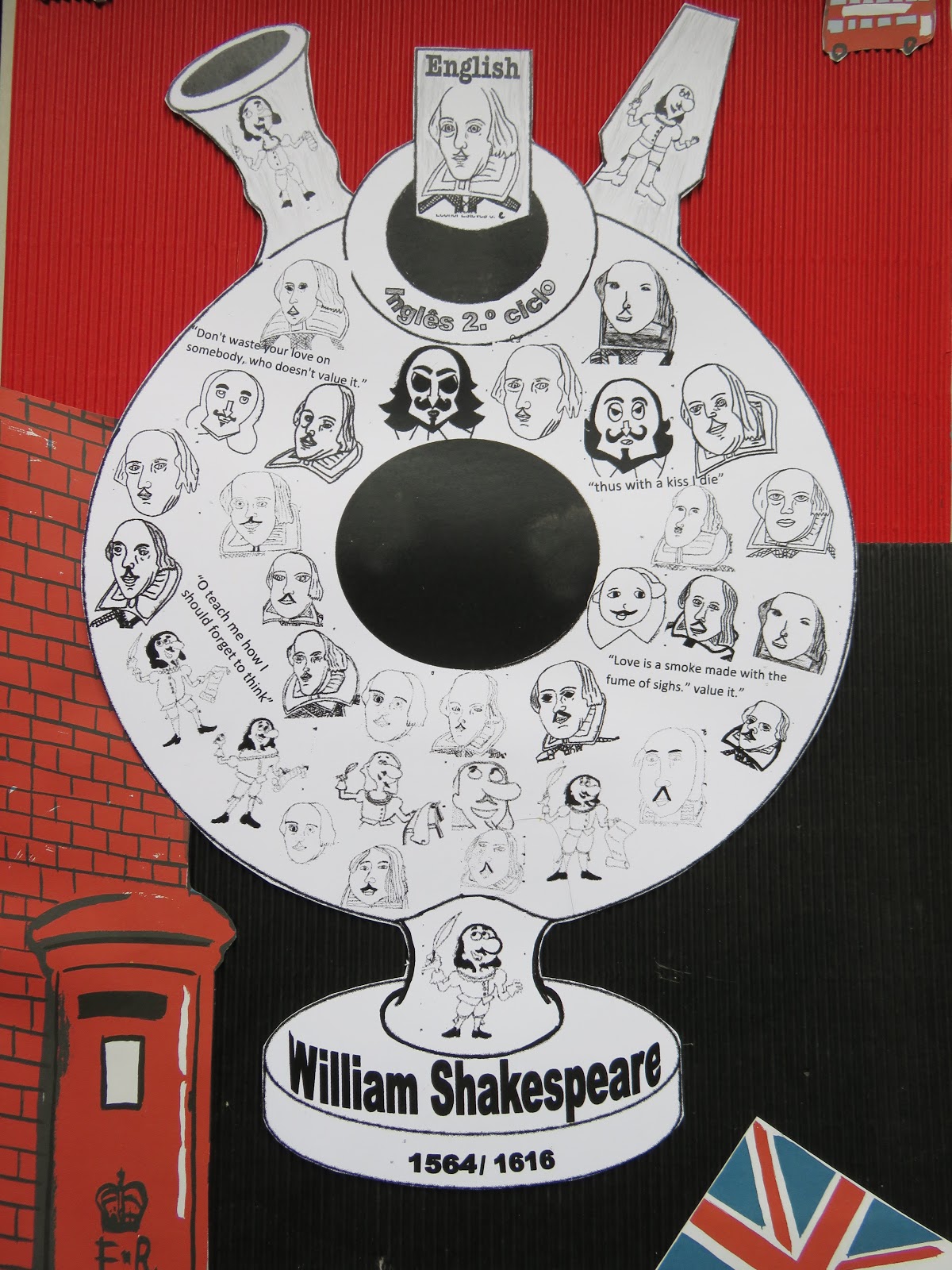 TRABALHO REALIZADO NA DISCIPLINA DE INGLÊS ATÉ CHEGAR A UM PRODUTO FINAL, TRANSPORTADO PARA A DECORAÇÃO DE UMA BILHA DE ROSCA DE BISALHÃES E EXPOSTO NO ESPAÇO MIGUEL TORGA. TODO O TRABALHO PREPARATÓRIO ESTÁ EXPOSTO NA BIBLIOTECA MJA.