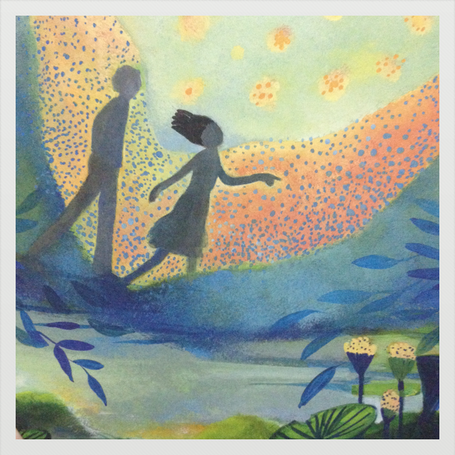 numa jarra, no meio de flores e animais que estavam a dançar à sua volta.