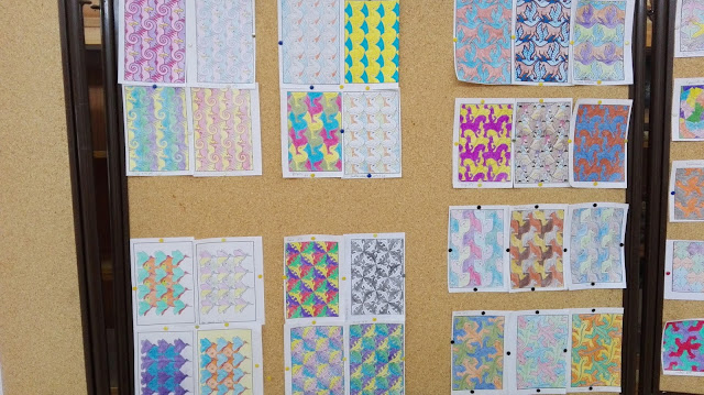 Estudo da obra de Escher na aulas de matemática do 8º ano, resultaram estas composições coloridas. Cada obra foi desconstruída para que os alunos entendessem o processo de construção através de associação organizada de formas geométricas.